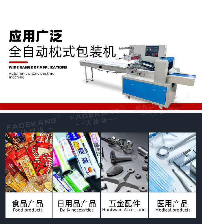 全自动枕式包装机适用行业产品:食品、日用品、五金配件、医用品等包装。